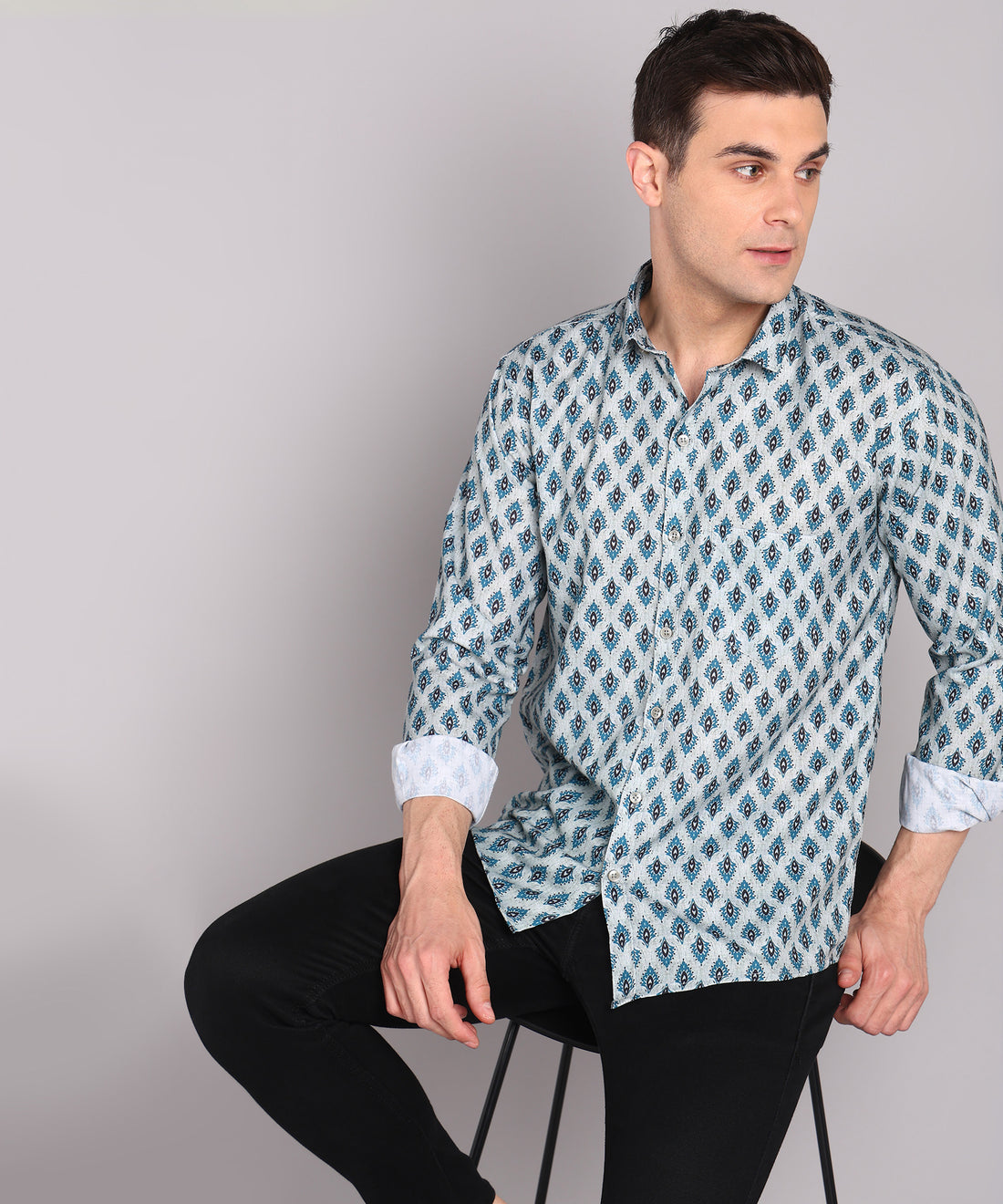 A refreshing aqua blue cotton shirt with delicate Sanganeri block prints. Soft, lightweight, and perfect...