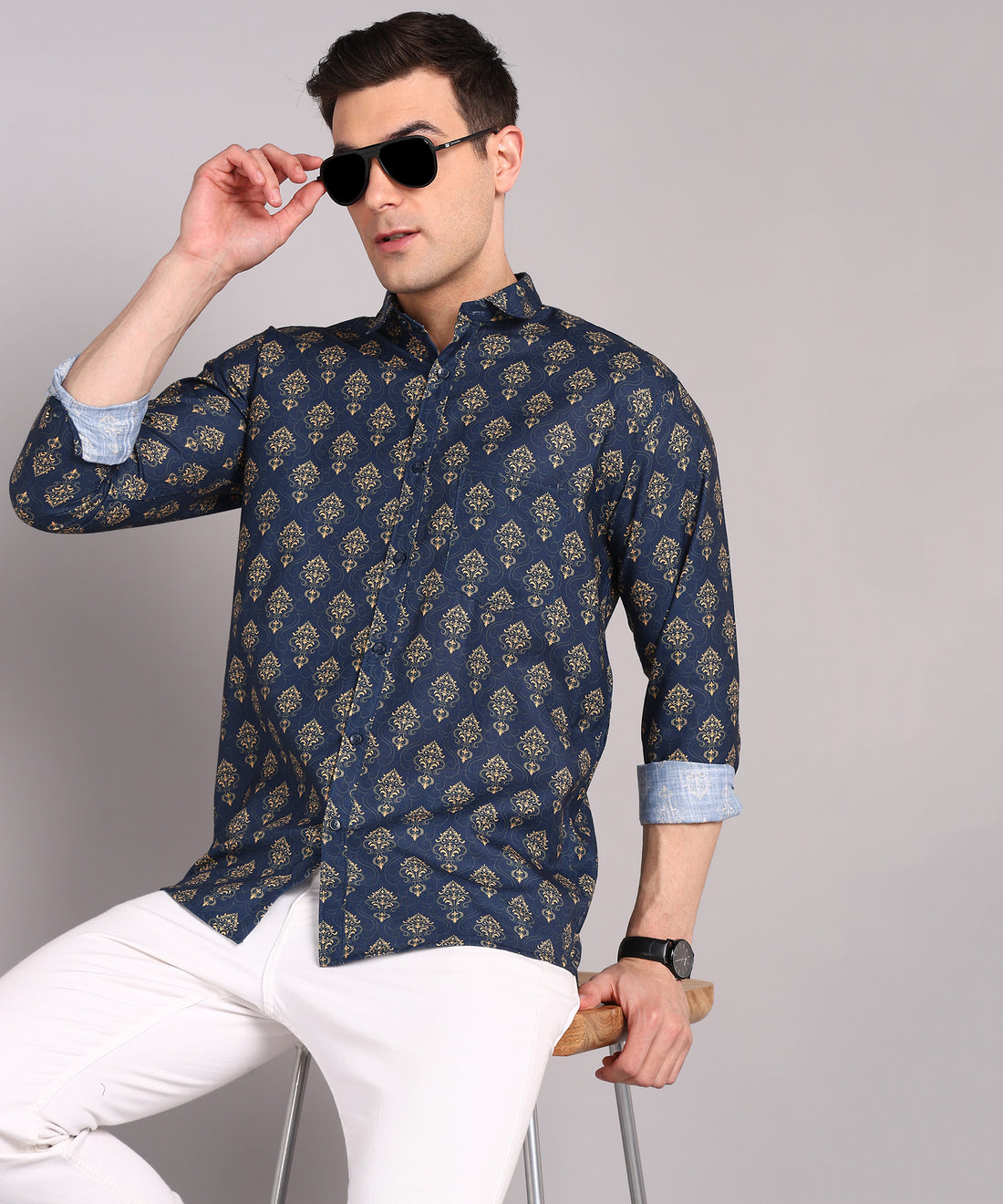 This navy blue cotton shirt showcases traditional Sanganeri block prints, blending heritage craftsmanship with contemporary...