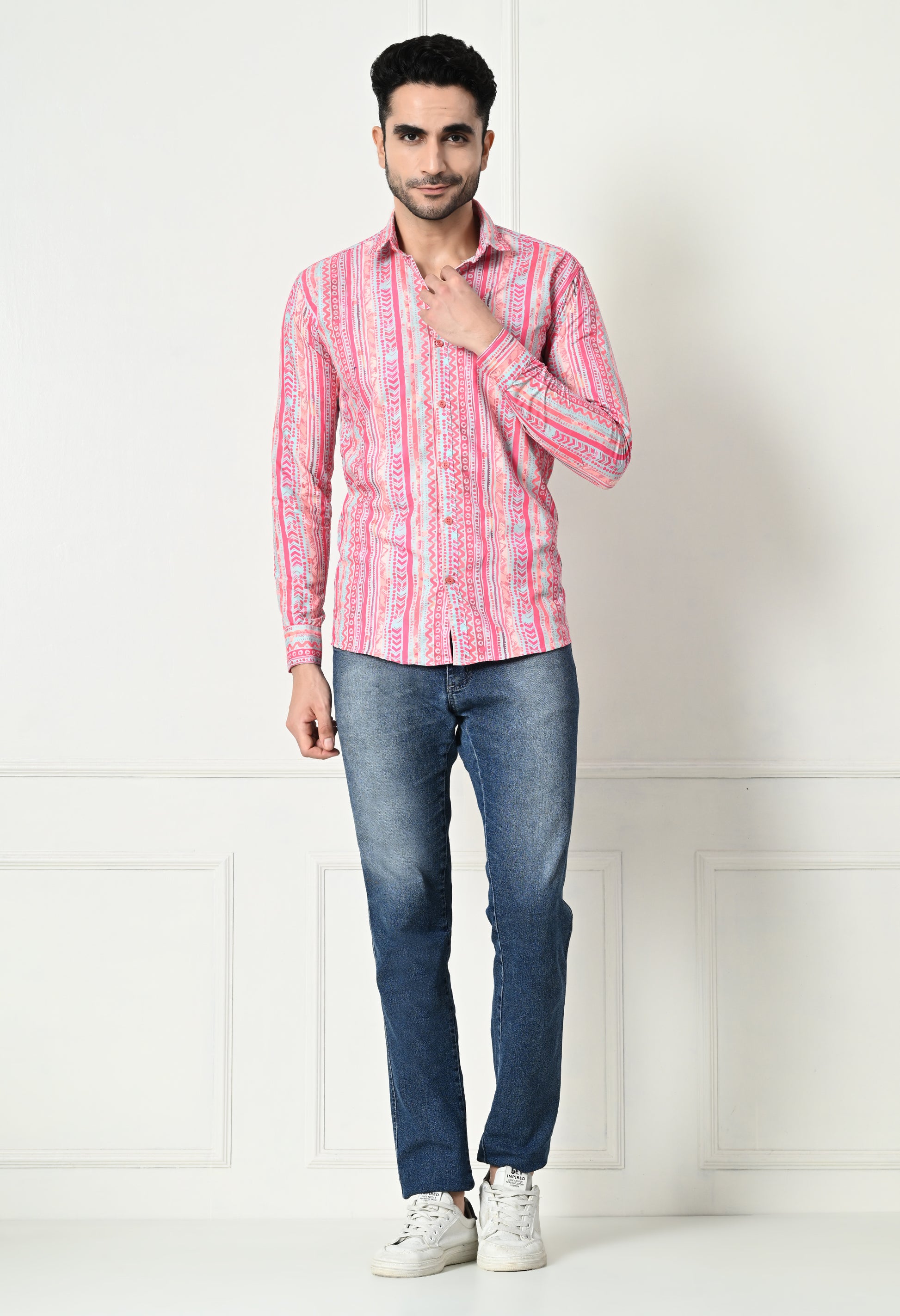 Pink Ethnic Stripe Print Slim Fit Festive Shirt