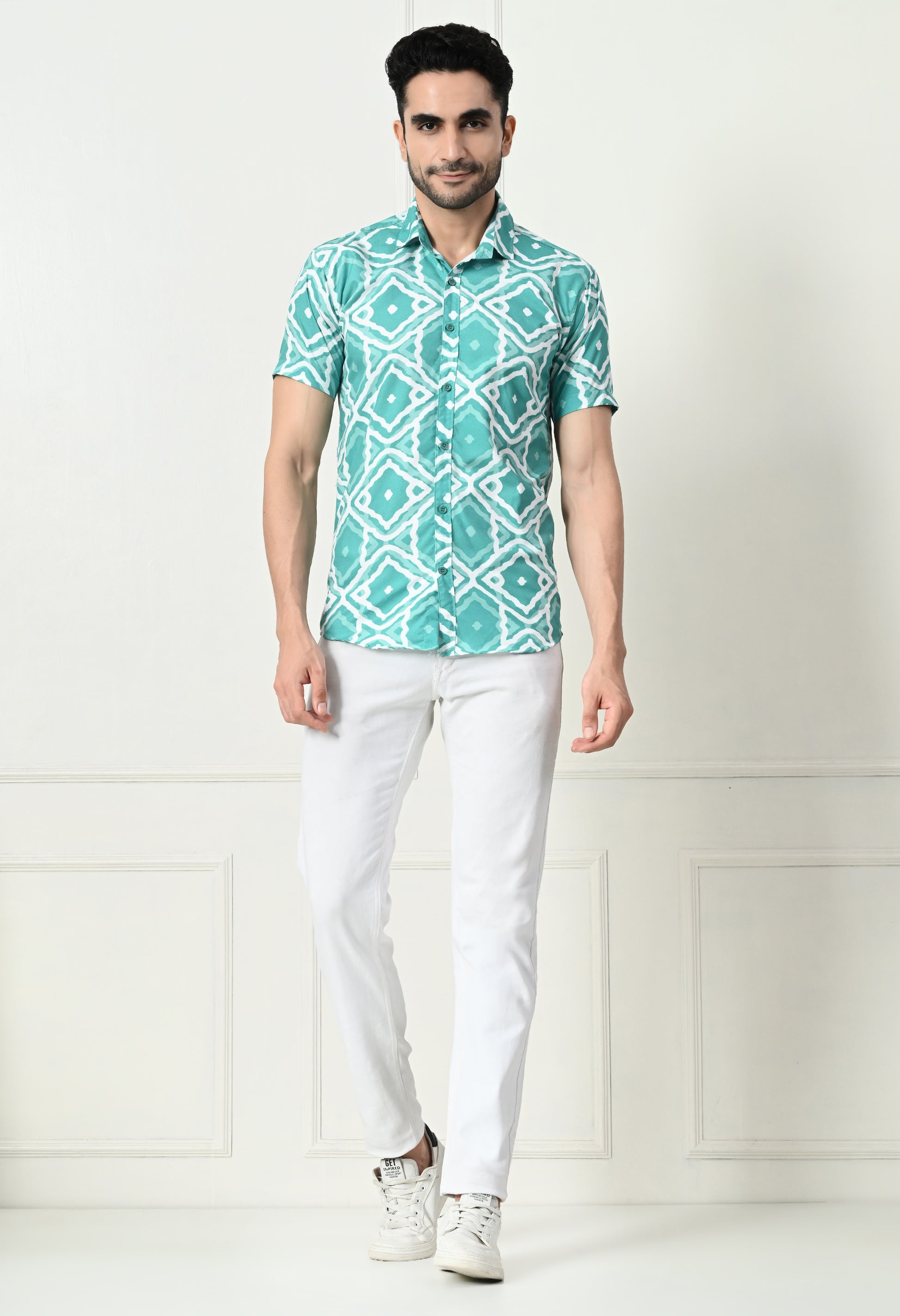 Elevate your casual wardrobe with the Sea Green Ikat Print Slim Fit Half-Sleeve Shirt. Crafted for comfort and style, its lightweight fabric and tailored slim fit ensure a flattering silhouette perfect for warm weather. The intricate Ikat-inspired geometric pattern in sea green and white offers a sophisticated nod to traditional craftsmanship, making it ideal for both relaxed outings and smart-casual occasions. This shirt combines heritage design with contemporary fit, delivering effortless elegance for your sunny day ensembles.