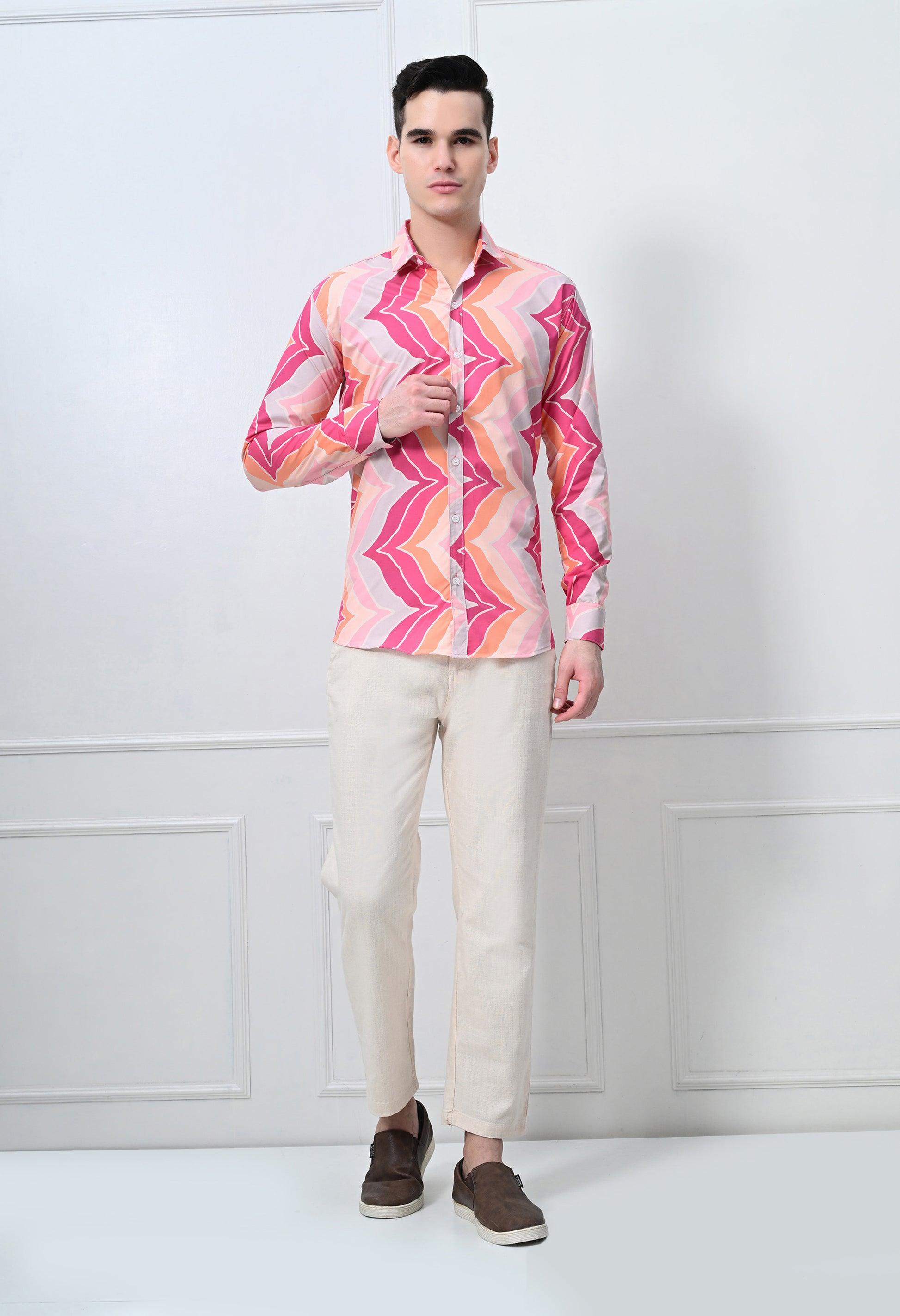 Embrace a blend of tradition and modernity with this Pink & Orange Leheriya Print Slim Fit Casual Shirt. Featuring a vibrant geometric chevron pattern in dynamic pink and orange hues, it offers a distinctive style for men who value cultural heritage while staying fashion-forward. The slim fit cut enhances your silhouette, making it ideal for casual occasions where making a confident statement matters.