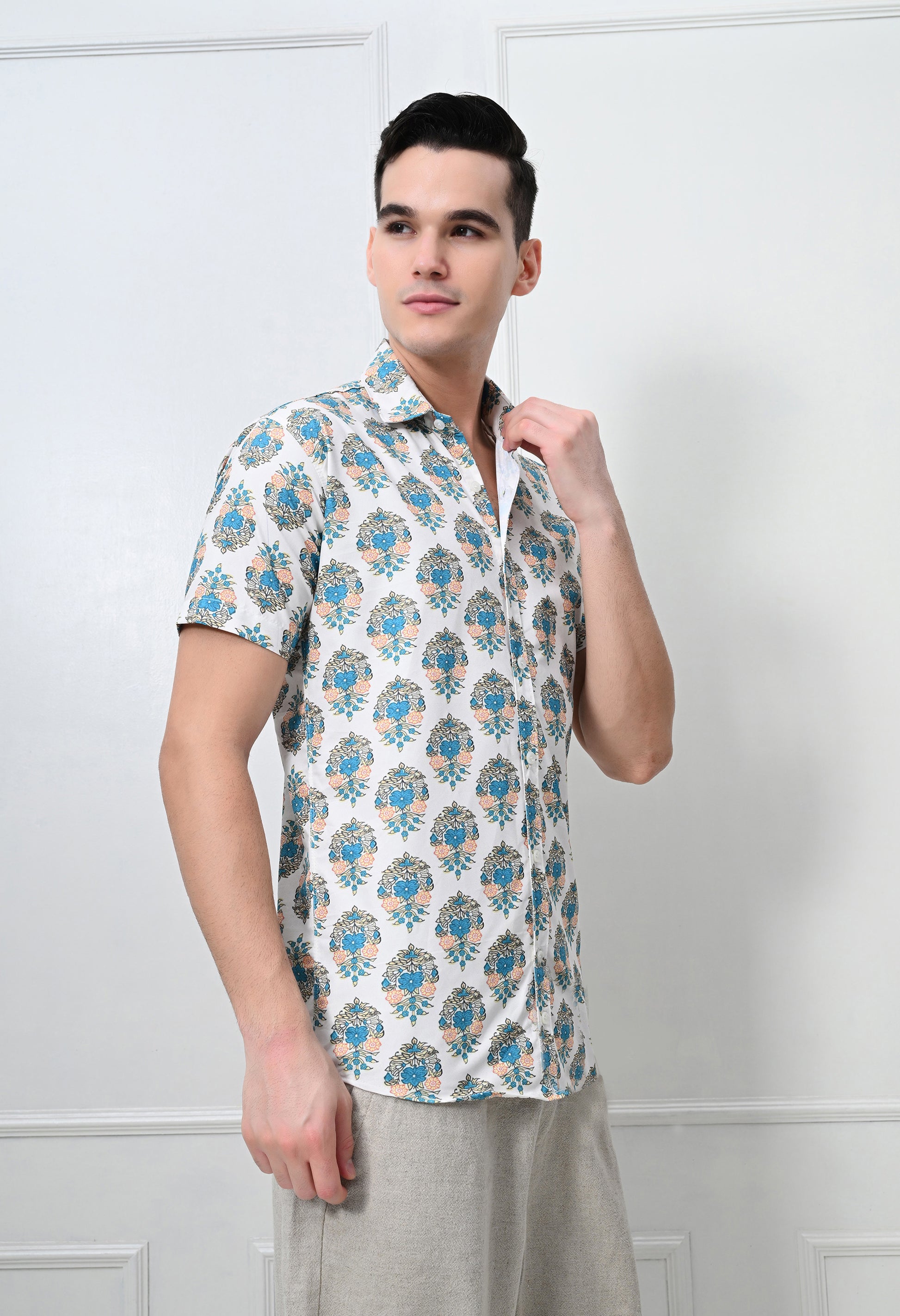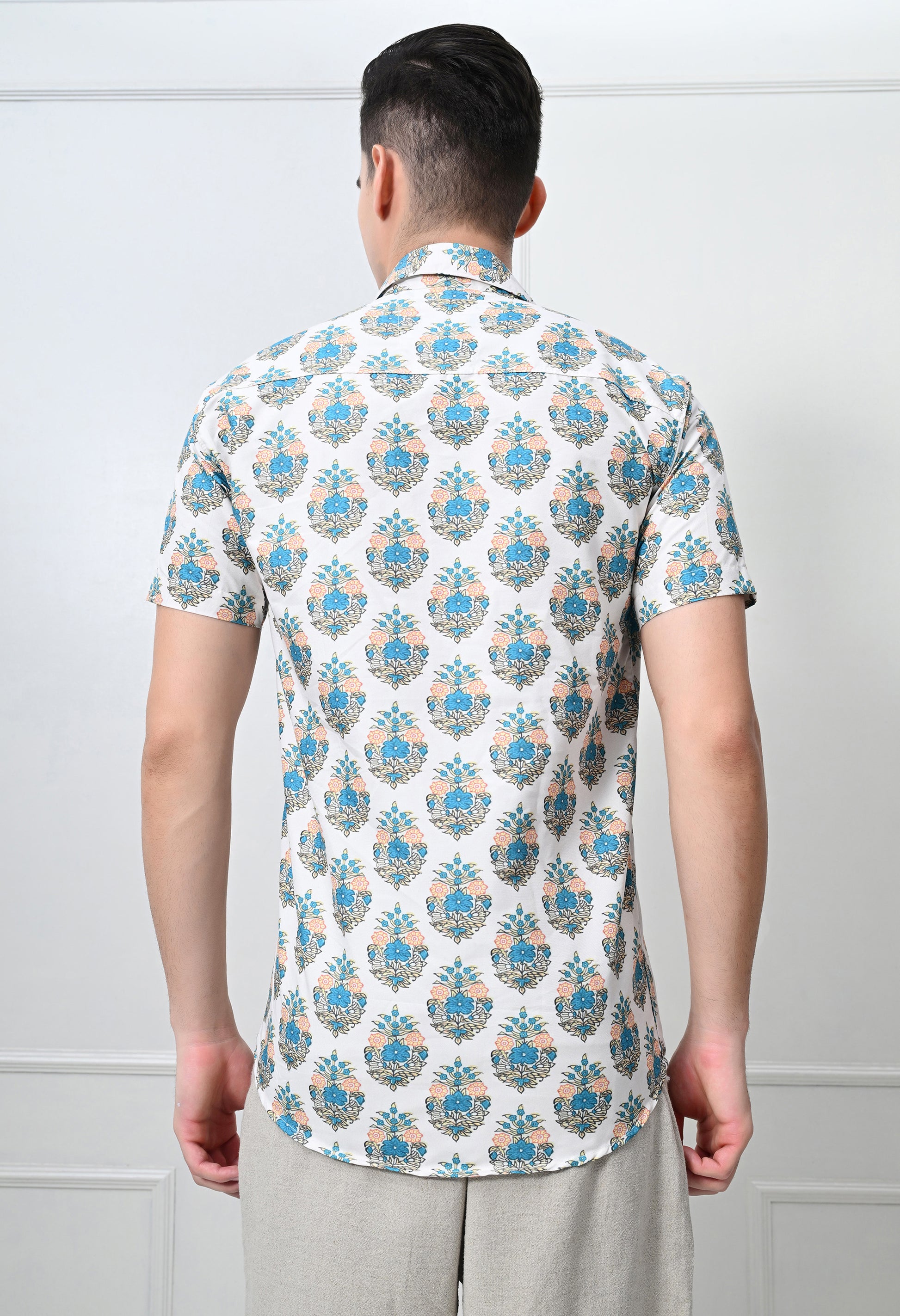This white cotton shirt combines comfort and contemporary design with its all-over teal geometric pattern. Crafted in a regular fit with short sleeves and a spread collar, it offers breathable wear suited for casual outings, vacations, and weekend activities. Pair it seamlessly with shorts, chinos, or denim to achieve a refined yet relaxed look that balances style and ease.