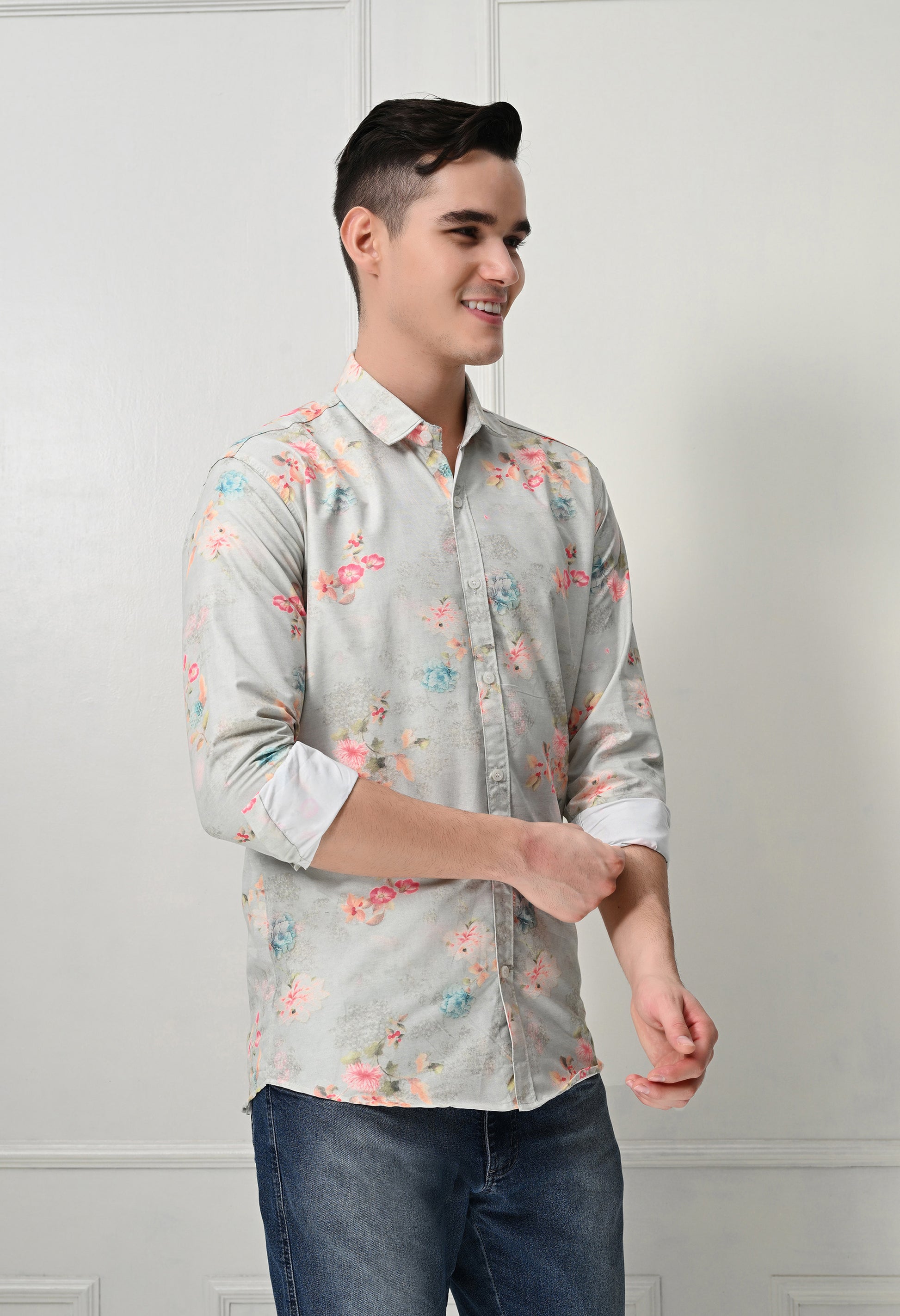 This light grey floral printed shirt combines subtlety and style, making it an excellent choice for both casual and semi-formal settings. Made from soft, breathable fabric, it ensures comfort throughout the day. The delicate pastel floral pattern adds an understated elegance, perfectly complementing jeans or chinos for a polished, contemporary appearance.