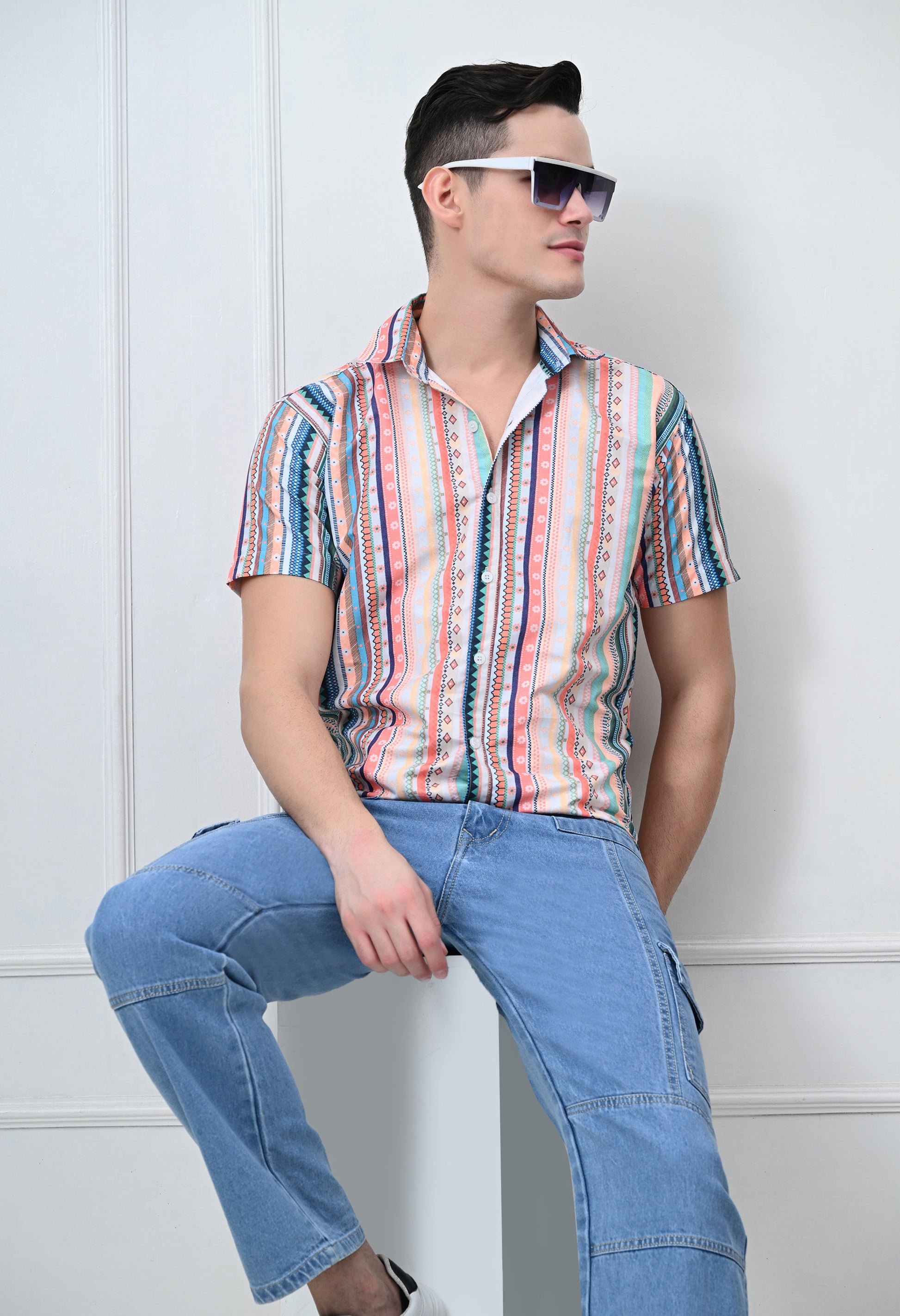 Elevate your casual wardrobe with this multicolor vertical stripe shirt crafted from lightweight cotton. Featuring a modern slim fit and half sleeves, it offers comfort and style in equal measure. Perfectly suited for both day and evening occasions, it pairs effortlessly with jeans or chinos to create a polished, fashion-forward look.