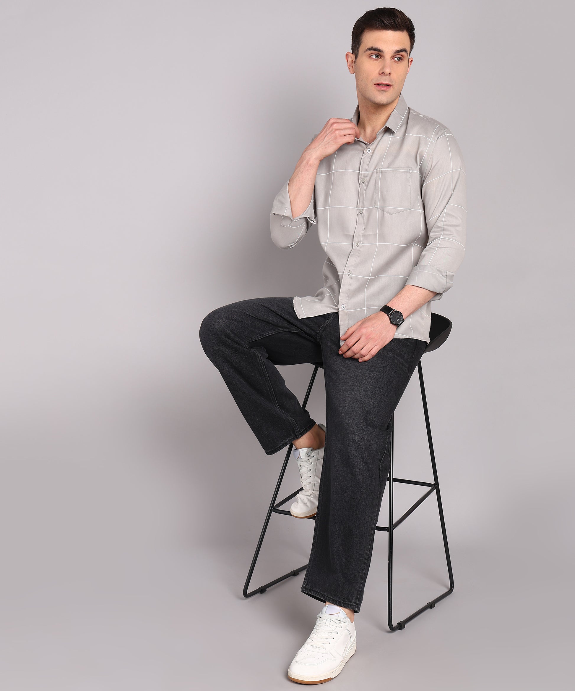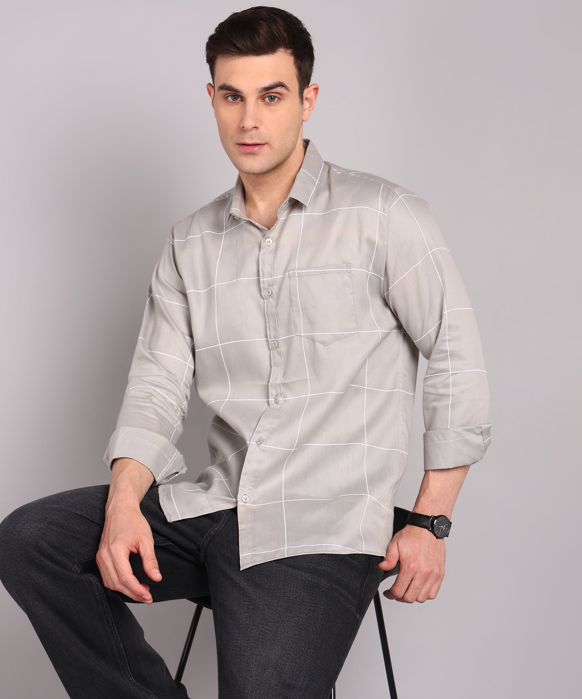 Sanganeri Grey & White Bold Checked Cotton Shirt